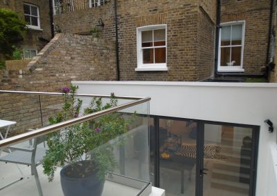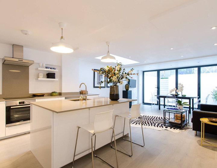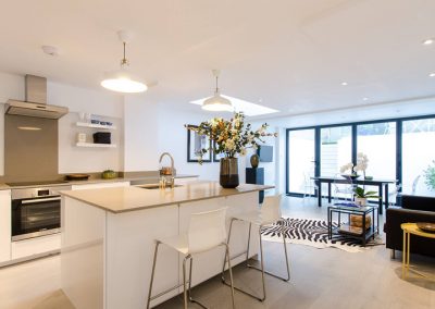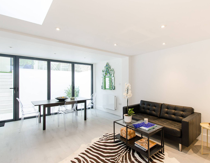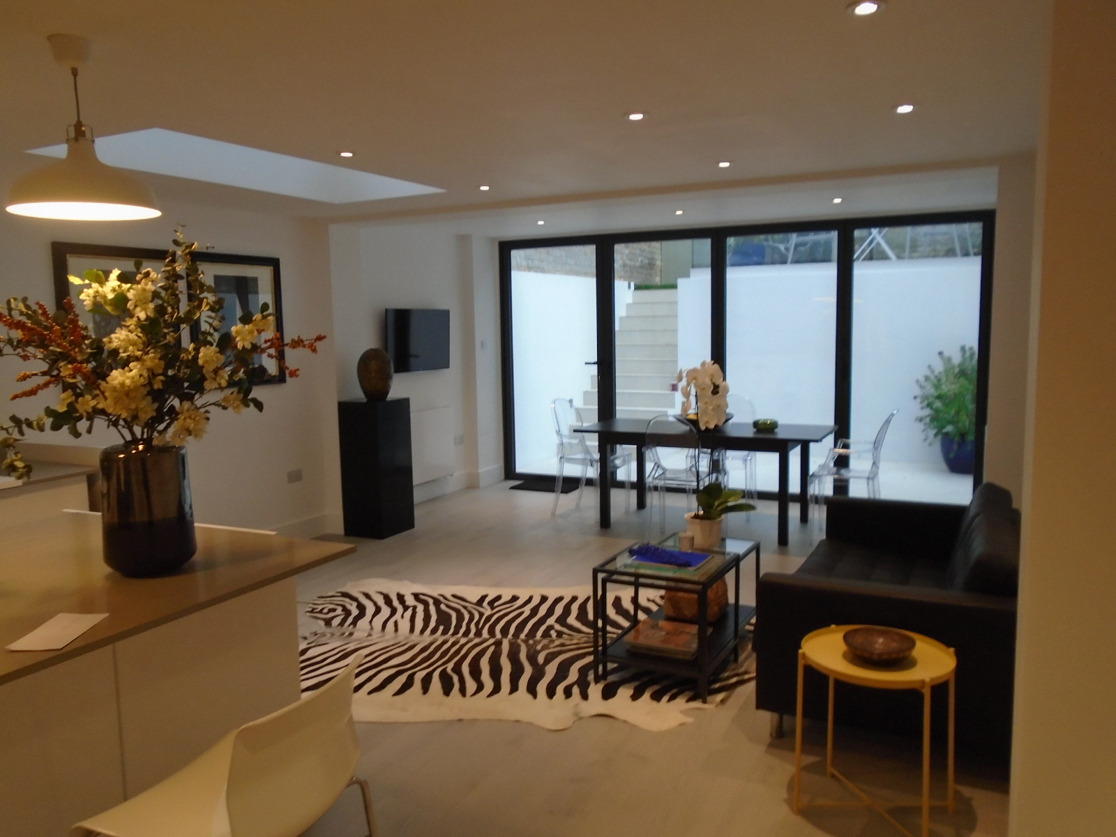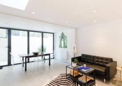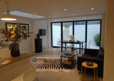 Located in a large end of terrace Victorian property in a conservation area in Chelsea, this ground and lower-ground floor flat were extensively altered and refurbished to a high specification to create a two-bedroom apartment with an open plan kitchen/dining area and separate reception room.
